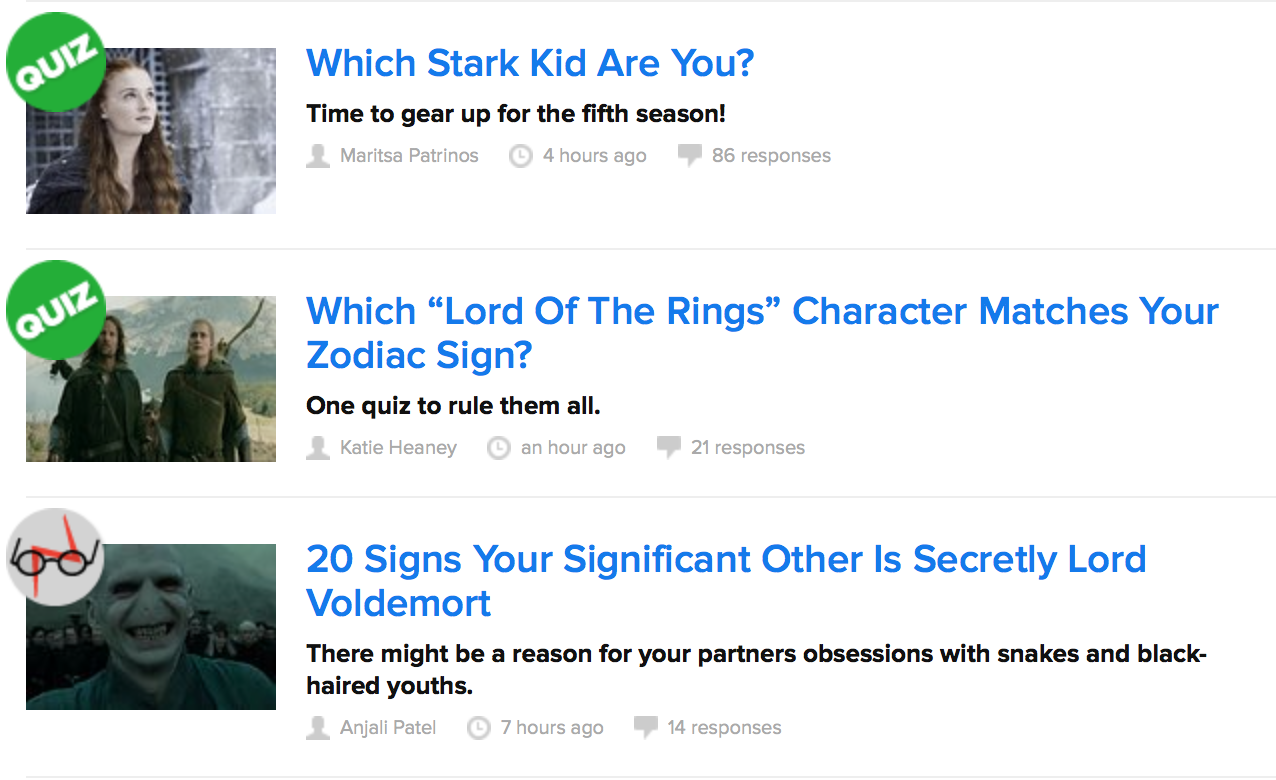 The next best thing: the Buzzfeed Books newsletter. I’m always looking for a good book and I like getting recommendations from a variety of sources – you never know what’s out there until you look! All you have to do is sign your email up to receive the weekly e-newsletter (it comes out on Wednesdays) and read away. My favourite part of the BuzzFeed Books site: the curated quizzes, natch (all you could ever be asked about Harry Potter!).